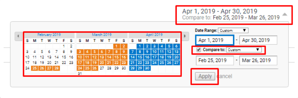Selecione as datas e compare-as com o período anterior. Observe que os dois meses escolhidos devem ter dias iguais e começar/terminar no mesmo dia. Para nossa análise, selecionamos 30 dias. Assim, o primeiro dia é segunda-feira e o último é terça-feira.