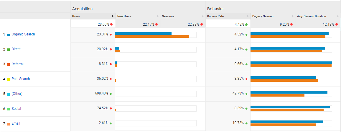 Esta captura de tela inclui outros indicadores para cada fonte de tráfego principal e a lista de fontes de tráfego principais. Assim, você pode comparar e analisar essas taxas para entender qual fonte de tráfego é a mais eficaz e qual canal você pode ignorar.